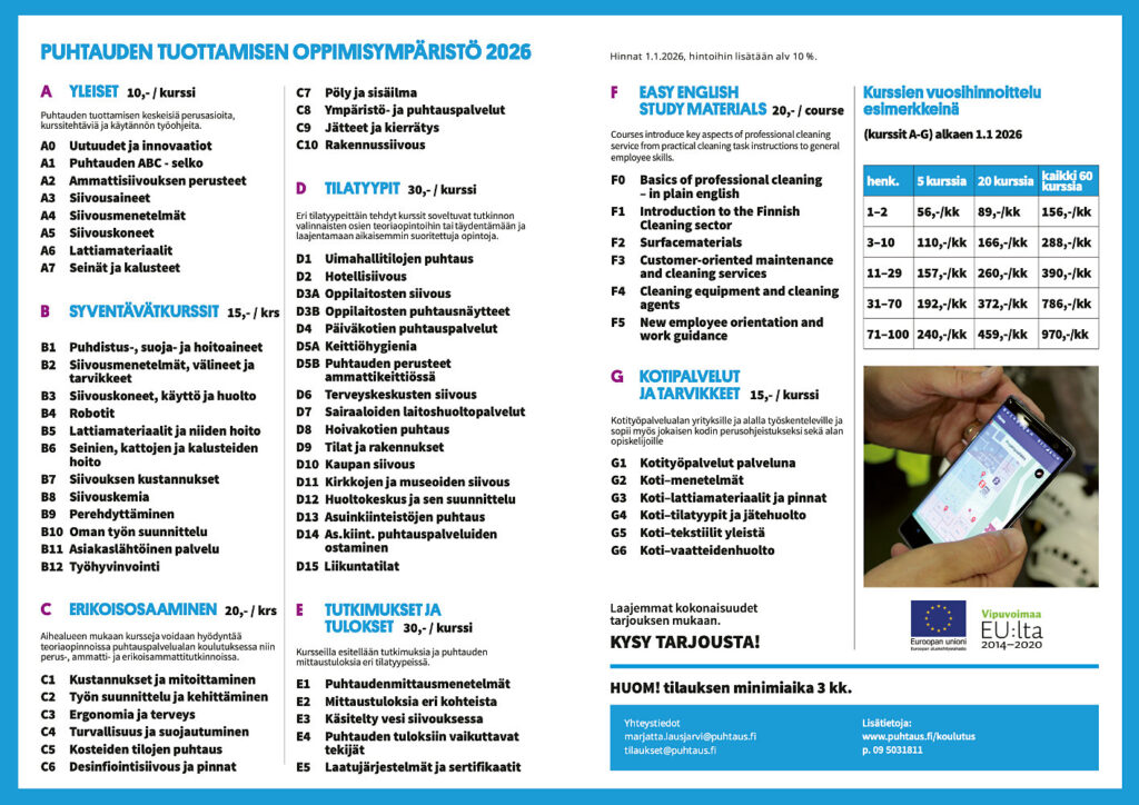 Kysy lisää sähköpostilla tilaukset@puhtaus.fi tai p. 09 503 1811