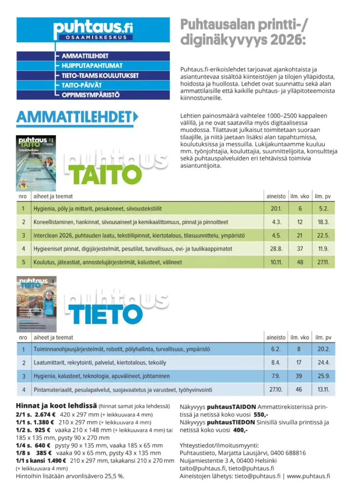 Puhtauden ammattilehdet ovat täynnä ajankohtaisia teemoja puhtauspalvelujen keskeisistä sisällöistä ja ratkaisuista käytännön ongelmiin sekä uusimmat tuote, robotti, materiaali, tutkimuskehityksistä. PuhtausTAITO-lehden tilaajat vastaavat käytännön puhtaanapidon haasteista eri kiinteistötyypeissä. PuhtausTIETO-lehden tilaajat vastaavat kiinteistöjen eri palvelujen hankinnoista ja laajasti ylläpitoon liittyvistä teemoista.