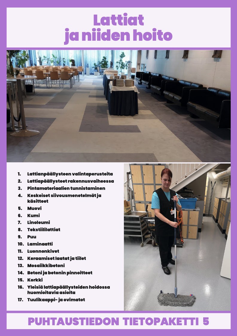 Lattiat ovat puhtauden ylläpidon näkökulmasta keskeinen työkohde. Eri lattiamateriaalit vaativat omat hoitomenetelmänsä, ja niiden oikea käsittely auttaa säilyttämään pinnat hyväkuntoisina sekä pidentämään käyttöikää. Tässä osiossa opit tunnistamaan yleisimmät lattiatyypit ja niiden puhdistus- ja hoitotarpeet.